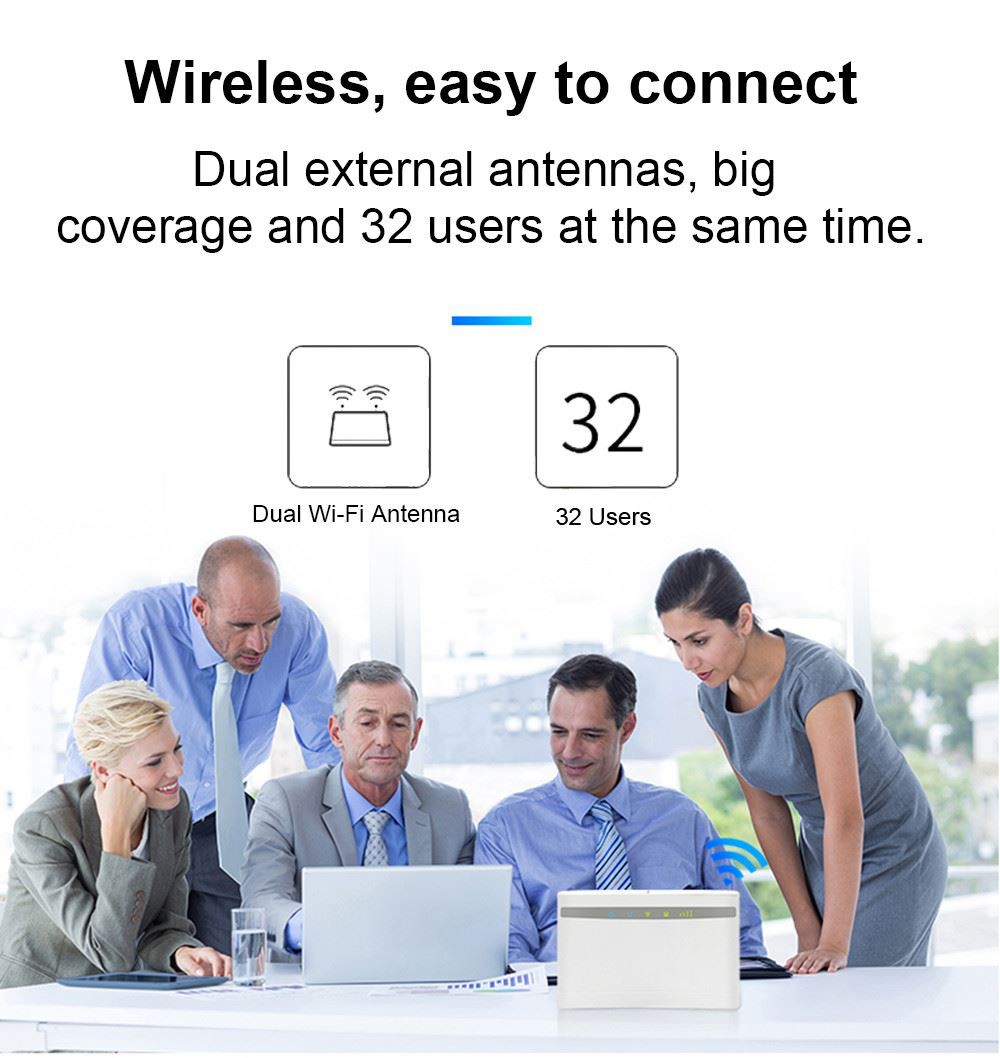 Is é seo an ródaire LTE faoi dhíon CPE an-dul chun cinn. Tá sé deartha chun freastal ar shonraí comhtháite agus riachtanais rochtana Wi-Fi d'úsáideoirí cónaithe, gnó agus fiontair. (Is féidir nascadh le antennas seachtracha cónascaire SMA!) 150M ardluais, LTE FDD: DL/UL 150M/ 50 Mbps (Cat 4). Aistrigh 4G go Wi-Fi, Níl rochtain Leathanbhanda ag teastáil, cuir isteach cárta SIM , plugáil agus seinn. Clúdaíonn wifi árasán agus teach iomlán, bain sult as an idirlíon ardluais i ngach áit. Éasca le nascadh, dhá antennas seachtracha, clúdach mór agus 32 úsáideoir ag an am céanna.